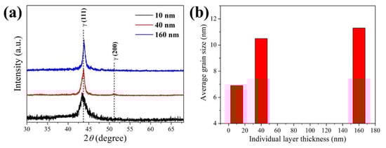 (a) XRD results of Ni/Ni3Al-MoW multilayers and (b) average grain sizes calculated by Debye–Scherrer’s equation with h = 10 nm, 40 nm, and 160 nm.
