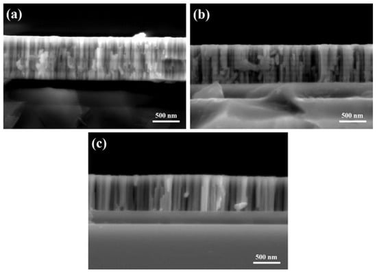 The cross-sectional FE-SEM images at a high magnification of the as-sputtered Ni/Ni3Al-MoW multilayers are shown in Figure 4. It can be seen that the sharp interfaces are presented between alternating layers within the sputtered Ni/Ni3Al-MoW multilayers for h = 160 nm and 40 nm, and the h is consistent with the designed value of the multilayers. When h = 10 nm, the layer interfaces in the lamellar structure are obscured due to the limitation of the SEM resolution for the observations, presenting a cross-sectional morphology similar to that of the monolayer film. In addition, the columnar crystal structures are observed, as shown in the cross-sectional morphology of the as-sputtered multilayers. Combined with the AFM and XRD characterization results, the Ni/Ni3Al-MoW multilayered film grows as columnar crystals along the normal direction of the (111) plane. According to the Structure Zone Model [,], when Tdep/Tm < 0.458, the grains of the films grow as columnar structures and the direction is perpendicular to the film/substrate interface, where Tdep is the deposition temperature (≤100 °C), and Tm is the melting point of the Ni-5 at.% Mo-5 at.% W alloy (about 1450 °C) []. Thus, the columnar grains are observed for all the Ni/Ni3Al-MoW deposited at room temperature due to the condition agreement of the abovementioned Structure Zone Model.