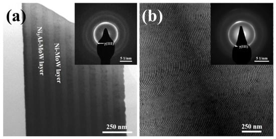 In order to characterize the finer microstructure of the films clearly, the cross-sectional BF-TEM observation of the representative h = 10 nm and 40 nm Ni/Ni3Al-MoW multilayers was utilized, as shown in Figure 5a,b, respectively. It can be found that the contrast between the Ni-MoW and Ni3Al-MoW layers is different, showing a typical lamellar structure with sharp and straight layer interfaces in Figure 5a. The layered structure with a brighter contrast is the Ni3Al-MoW layers; on the contrary, the layers with the darker contrast are the Ni-MoW layers, due to more difficulty of the transmitted electron beam to pass through the phases of the Ni-MoW layers. As demonstrated in the inset of Figure 5a, the corresponding SAD results indicate that the diffraction rings of the Ni-MoW layers and Ni3Al-MoW layers in the multilayers with h = 40 nm overlap each other, showing the FCC-structured γ-Ni-based solid solution phases. The γ-Ni (111) diffraction ring exhibits a brighter contrast, further confirming that the texture plane of the multilayer is (111). Figure 5b shows that the volume proportions of the layer interfaces increase significantly for the multilayered film with h = 10 nm, presenting the lamellar structure. A careful observation of the SAD results corresponding to the multilayered film, as illustrated in the inset of Figure 5b, shows that both a broad halo and bright γ-Ni (111) diffraction ring are observed, verifying the coexistence of amorphous and nanocrystalline structures of the Ni/Ni3Al-MoW, multilayered with the induction of more layer interfaces at a smaller h.
