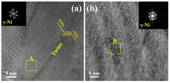 Figure 6a shows that the twins are displayed in a region between the space of the two adjacent layer interfaces of the 40 nm Ni/Ni3Al-MoW multilayer. By the fast Fourier transformation of the squared region marked A near the nano-twins in Figure 6a, it can be found that the lattice fringes are interpreted as the γ-Ni-based solid solution phase, and the twin planes are mainly γ (111) with an angle between them of 118°. The formation of the twins within the 40 nm Ni/Ni3Al-MoW multilayer can be attributed to the reduction of the stacking fault energy (SFE). Among the many kinds of common additive elements in Ni-based alloys, Mo and W are two of the most effective alloying elements to reduce the SFE in Ni []. Thus, the SFE is significantly reduced, and it promoted the formation of nano-twins with the co-alloying of the Mo and W elements in the Ni/Ni3Al multilayer with h = 40 nm. Meanwhile, the sputtering Ni/Ni3Al multilayers with the Mo-W dopant can also improve the deposition rates of the films, leading to further facilitating the formation of nano-twins. When h =10 nm, the arrangement of lattice fringes in the Ni/Ni3Al multilayers is relatively disordered, as demonstrated in Figure 6b, showing a strong tendency for amorphization. The γ-Ni-based solid solution phase is also verified by the fast Fourier transform result of the square B region with a crystalline domain. The lack of twins is observed in the HRTEM of the 10 nm Ni/Ni3Al-MoW multilayer. It is reported that the alleviated coherency stress can determine the formation of twins [,]. In order to generate the nuclei of the twin interface, a leading partial dislocation must be emitted within the region of the grain boundary, which has high-density dislocations. Then, a twinning partial dislocation of the same Burgers vector on the adjacent slip plane is released. Subsequently, a series of atoms near the nucleation are stacked continuously along the direction of the two partial dislocations to increase the size of the twins. A critical hp for the multilayered film is required for the basic stacking size of nucleation and growth during the nano-twins formation. In this case, when the coherent elastic strain energy, caused by the coherent mismatch, is equal to the tension of the leading dislocation line, the critical hp for the nano-twin nucleation and growth in the Ni/Ni3Al-MoW multilayer can be calculated according to the following []:
