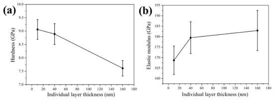 Figure 3a shows that the diffraction peaks of the γ-Ni-based solid solution phase with a face-centered cubic (FCC) structure coincide on the (111) and (200) crystal planes for the Ni/Ni3Al-MoW multilayers with h = 160 nm and 40 nm. This indicates that the lattice difference of the γ-Ni-based solid solution phases between the Ni-MoW and Ni3Al-MoW layers is very small. Under the effect of the compressive internal stress of the as-sputtered multilayer, the solid solution of the Mo-W elements causes a slight lattice distortion, leading to the lattice constants between the Ni-MoW and Ni3Al-MoW layers being almost the same, without an obvious lattice mismatch. Compared with the intensities of the diffraction peaks, it is found that the diffraction peak on the (111) plane is the strongest, which indicates that the deposited thin film exhibits the (111) plane texture. The multilayers grow along the (111) direction due to the minimum surface energy of the (111) plane for the FCC-structured γ-Ni-based solid solution, and thus the deposited atoms tend to stack on the close-packed (111) plane in order to reduce the surface energy. In this paper, no form of external heat source was applied to the substrate during the sputtering process. Once the atoms were deposited on the surface of the film, it was difficult to rearrange them by diffusion. Therefore, the as-sputtered multilayer shows a strong texture on the (111) plane. The average crystalline or grain size calculated by Debye–Scherrer’s equation inside the multilayers, as shown in Figure 3b, decreases with the reduction of h for the increment of the peak width at half the height (FWHM) of the γ-Ni (111) diffraction peak, indicating that the layer interfaced within the multilayers can inhibit the grain growth. When h = 10 nm, it is worthy to note that attenuated and broad in γ-Ni (111) peaks can be detected at 2θ between 42° and 46°, showing a lower crystallinity. This implies that the formation of the amorphous phase is promoted [], resulting from disordered atom arrangements induced by more interfaces with a lower h.