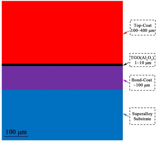 In this study, a thermal–mechanical coupling analysis step was used to calculate the residual stress of the TBCs, and the following assumptions were made: (1) All layers were isotropic, none of the layers had defects, and the interface between two adjacent layers was flat. (2) Heat transfer only occurred in the coating with air through upper-surface convection, and the side was adiabatic without considering thermal radiation. (3) The deformation of the entire coating system was assumed to be continuous without considering defects such as cracks and pores. (4) The creep and plastic deformation of each layer were negligible. (5) In thermal barrier coatings, failure can be divided into two cases, one is caused by thermal stress mismatch, and the other is caused by thermally grown oxide (TGO). This paper studies the post-spraying cooling process, rather than sustained high-temperature service process. Therefore, in these two failure mechanisms, the thermal mismatch leads to the interface separation failure of the coating, and the effect of TGO can be ignored []. (6) There is no heat resistance at the interfaces between adjacent layers [].