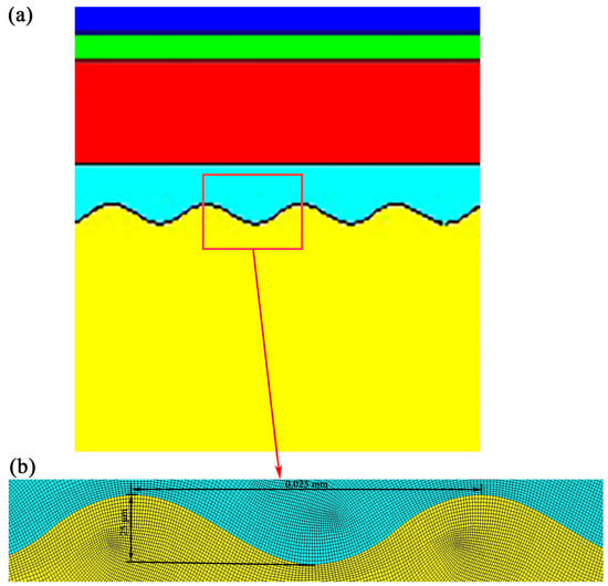 The model was established based on the actual usage of the TBCs and its thermal expansion coefficient, considering the heat transfer mechanisms of heat conduction and convection, as shown in Figure 2a. Figure 3a shows the finite element model after changing the interface structure, and Figure 3b shows the enlarged schematic of the mesh of 3a at the interface location.