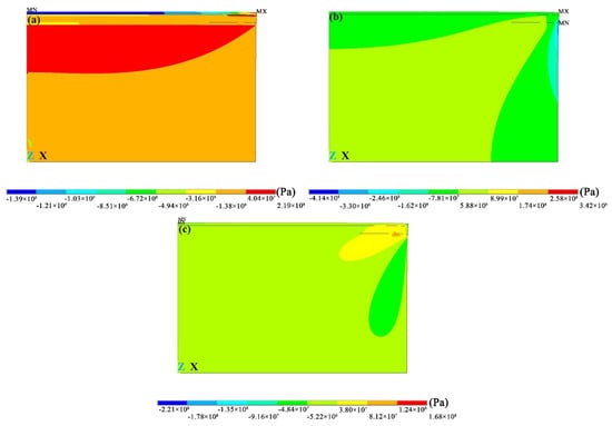 Contour plot of the residual stress when the coating was cooled to room temperature from high temperature: (a) radial stress; (b) axial stress and (c) shear stress.