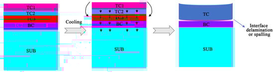 The stress distribution after cooling from high temperature to room temperature over 1800 s after spraying is shown in Figure 4. The tensile stress was positive and the compressive stress was negative. As shown in Figure 4a, the compressive stress primarily existed in the ceramic layer and interface, and tensile stress existed near the substrate layer. The maximum tensile and the maximum compressive stresses were 219 and 1390 MPa, respectively. Figure 4b shows the axial stress distribution nephogram. It can be seen that the maximum axial tensile stress in the ceramic layer was 324 MPa. Figure 4c shows the shear stress distribution map. It can be seen that the tensile and compressive stresses mainly existed in the interior of the coating, and the residual stress was concentrated at the edge of the coating, especially near the interface. Figure 5 shows the failure mechanism of the cooling coating. Because of the different thermal expansion coefficients, when the sprayed sample is cooled, the shrinkage ratio of each layer was different, and a bending moment was formed on the coating, as shown in the diagram. This is equivalent to stretching the outer surface of the coating. Simultaneously, there was a decrease in the tensile stress between the contact surfaces of each layer of the substrate. At this time, the coating can delaminate from the interface of each layer. Therefore, it was important to study the distribution of residual stress of the coating at the interface during thickness optimization.