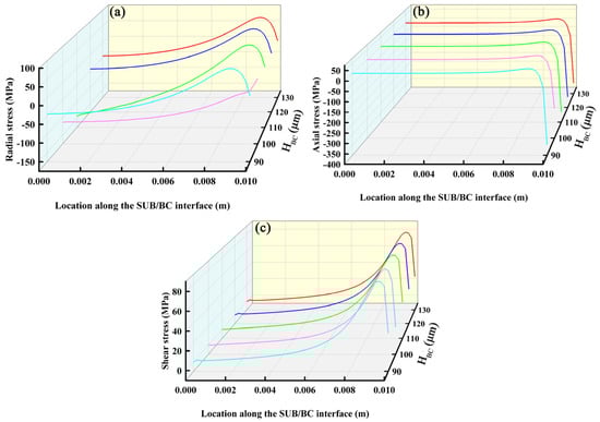 Stress distributions along SUB/BC interface: (a) radial stress; (b) axial stress and (c) shear stress.