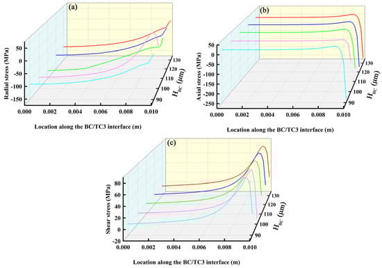 Stress distributions along BC/TC3 interface: (a) radial stress; (b) axial stress and (c) shear stress.