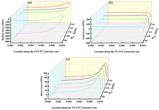 Stress distributions along TC3/TC2 interface: (a) radial stress; (b) axial stress and (c) shear stress.