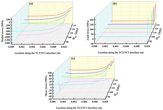 Stress distributions along TC2/TC1 interface: (a) radial stress; (b) axial stress and (c) shear stress.
