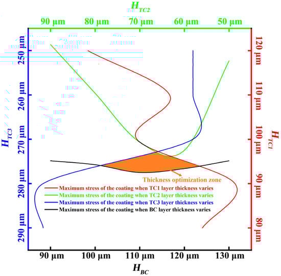 In order to ensure the best effect of the coating, the thickness of each coating and its maximum stress were optimized, and the design optimization diagram of the stress thickness was obtained, as shown in Figure 10. Figure 10 shows the curve of the maximum stress of the coating with a change of thickness of each layer. The curves in each color represent the maximum stresses as the thickness of the different layers varies. The stress axes are all located on the left side of the respective axes, but since the optimization is conducted to determine the thickness, the axes showing the stress values are hidden, and only the axes showing the thickness are kept for the plot. It can be seen that since the thermal performance parameters of the material of each layer of the coating change with temperature, the maximum stress of the coating after the change of the thickness of each layer presents a non-linear situation, and since it is necessary to ensure that the overall stress level for the use of the coating is not too high, it does not directly select the lowest minimum stress point of each layer. Instead, a reasonable range of thickness optimization is obtained by selecting the location where the stress is lower for each layer thickness change, as shown in the orange area in the figure. Therefore, the thickness of each layer is selected from this region. The thickness optimization range in the figure is based on the theoretical value calculated by the simulation, which is about 95 μm. The thickness of our current spraying process is an integer multiple at each spraying. Therefore, the thickness of the TC1 layer close to the theoretical range is selected as 100 μm. Similarly, the TC3 layer also selects 270 μm instead of 275 μm. Thus, the thicknesses of the BC, TC3, TC2 and TC1 layers are about 110, 270, 70 and 100 μm, respectively.