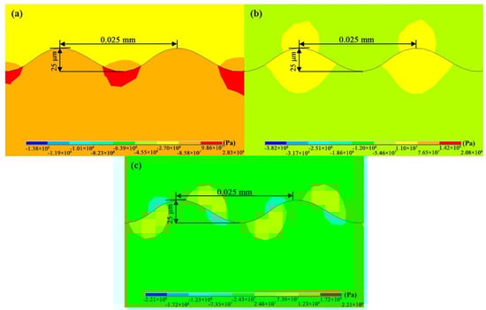 Figure 11 shows the stress distribution contour plot of stress of the interface position amplification after the change in the SUB interface structure. Combined with Figure 4, it can be seen that along the sine wave interface, the stress changed with position. The tensile and compressive stresses at the vertical interface of the matrix and bond coat layers appeared at the peaks and valleys of the interface, respectively. The maximum radial tensile stress appeared in the middle of the valley of the interface, and the axial tensile stress appeared in the middle of the valley of the interface. As can be seen from the maximum compressive stress in the figure, the compressive stress decreases significantly with increasing wavelength. This is similar to the results obtained by Han and Hou; they showed that the residual stresses were clearly influenced by the interfacial morphological units. The compressive stresses are present in the depressed morphological units [,].