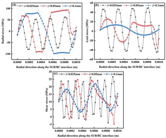 Stress distributions of SUB/BC interface at different wavelengths: (a) radial stress; (b) axial stress and (c) shear stress.