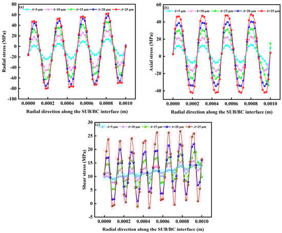 Figure 15 shows the stress changes in the interface structure of the BC layer under different amplitudes at the same distance. As shown in Figure 15, the change in radial stress is periodic when the amplitude changes, and the maximum tensile and compressive stresses appear at the interface peak and trough, respectively. It can be seen that as the amplitude increases, the stress at the interface increases, and the effect on tensile stress is much greater than the effect on compressive stress, indicating that the coating is prone to delamination failure. This is due to the increase in amplitude, which leads to roughness of the interface, and the interface stress increases with the increase in the roughness of the interface. The greater the amplitude, the greater the residual stress, indicating that a rough interface causes a larger residual stress.