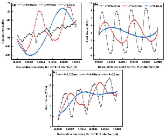 Stress distributions of BC/TC3 interface at different wavelengths: (a) radial stress; (b) axial stress and (c) shear stress.