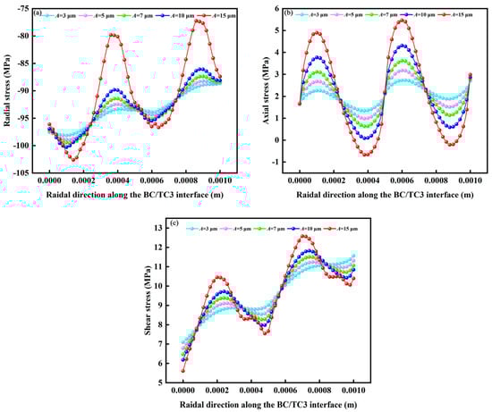 Stress distributions of BC/TC3 layer interface at different amplitudes: (a) radial stress; (b) axial stress and (c) shear stress.