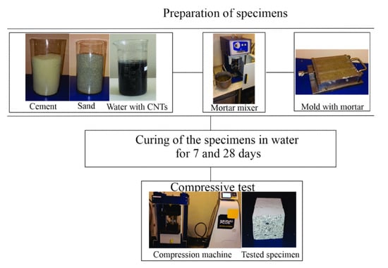 The w/c ratio used in the present work was 0.47, and the cement to sand proportion used was 1:4. First, cement and sand were mixed (E095 Mortar mixer, Matest, Treviolo, Italy) for 2.0 min, then the MWCNTS/water mixture was added and mixed for 5 min. The size of the molds were 40 mm × 40 mm × 160 mm. The mortar was compacted through a vibration machine (C278 Vibrating table, Matest, Treviolo, Italy) for 30 s. Similarly, a series of mortars and the one without different MWCNT contents (0.001%, 0.01%, 0.05%, and 0.1% by weight of cement) were cast. The specimens were also prepared by adding in the MWCNTS/water surfactant DISPERBYK-199 (produced by company BYK, Wesel, Germany). The weights of the surfactants were 4.4, 44, 220, and 440 mg, respectively. After 24 h, the specimens were de-molded, and the mortar sample was immersed in water at 20 ± 0.2 °C temperature (Figure 2).