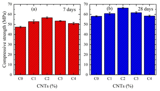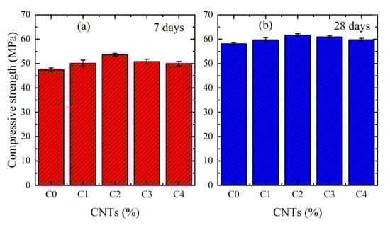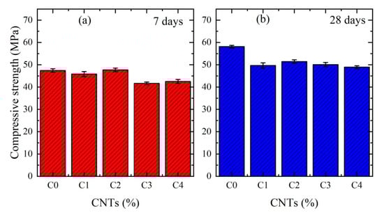 Figure 5a,b show the compressive strength of the mortar with different wt.% of MWCNTs for 7 and 28 days, respectively, when the surfactant in the MWCNT/water was added.
