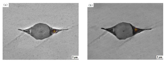 According to the pitting mechanism of stainless steel, inclusions are one of the main reasons for the stress corrosion cracking []. Therefore, Al2O3-MgO inclusions are the main reason for the destruction of the Super 13Cr surface passivation film. The properties of Al2O3-MgO inclusions are roughly similar to those of Al2O3. They have a high melting point, a high level of hardness, and a corrosion resistance to acids, which make it impossible for them to react significantly with a dilute sulfuric acid solution in a short time. Thus, the shape and the dimension of the inclusions during acidification in this paper basically did not change. In addition, the inclusion cloud did not fill with stainless steel surface defects; there was a fraction of pore areas between the inclusion periphery and the matrix phase. Due to the high corrosion resistance of the inclusion itself, the pitting corrosion of the stainless steel at the inclusion site may have been caused by the corrosion of the gap between the matrix phase and the inclusions. Therefore, the chemical elements in the gap, depending on the duration, were analyzed.