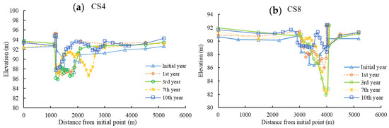 Graphs of different section shapes (nine projects): (a–d) respectively show CS4 section, CS8 section, CS16 section and CS20 section morphological adjustment in different years.