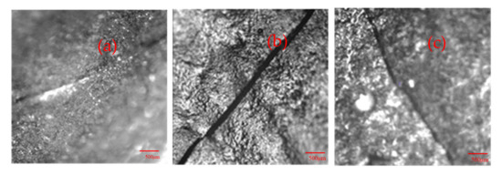 It can be seen from Figure 3 and Table 6 that the crack areal density decreases with the increase of scanning speed and focusing current. The minimum average value of the crack areal density in the scanning speed of 10–12 mm/s is 0.0163, and the variation range is 0.0213–0.0163; that is, this interval is the preferred interval; the minimum average value of the crack areal density in the focus current [700–720 × 10−3 A] is 0.019, and the variation range is 0.023–0.019; that is, this interval is the preferred interval.