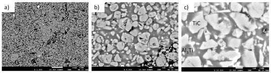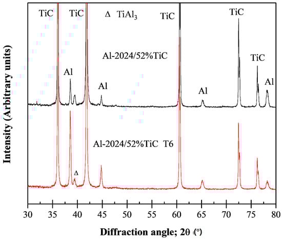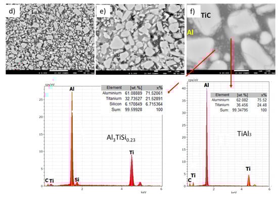The larger amount of phase precipitated of Al3Ti in the metallic matrix of the as-infiltrated samples Figure 3a–c compared to the smaller amount of second-phase precipitates in samples after heat treatment (T6) (Figure 3d-f) was evident. This is because during the heat treatment, the precipitate in the metallic matrix was dissolved and homogeneously distributed after solution treatment and artificially aged []. These results were previously reported by other authors [,,].