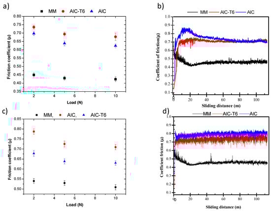 Mean friction coefficients of Al-MM, AlC, and AlC-T6 at three loading conditions and dynamic friction coefficients at 5 N: in the tribological pairs with (a,b) 52100 steel and (c,d) α-Al2O3, respectively.