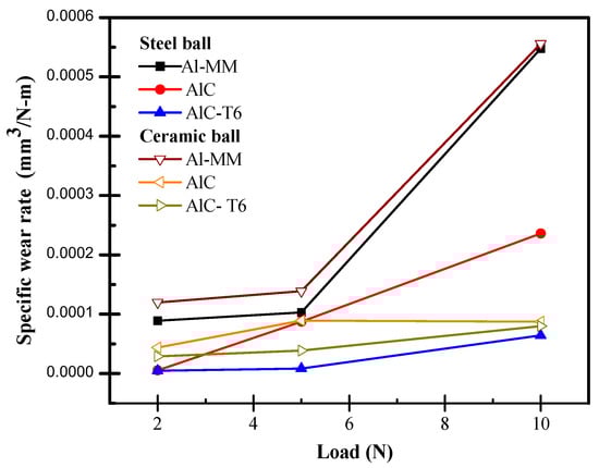 Variation in the wear rate with respect to the normal load applied in the tribological pairs of MM and AlC in contact with 52100 steel and α-alumina pin.