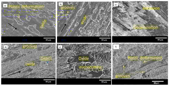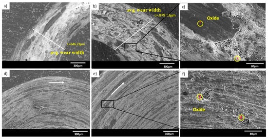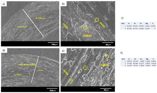 Figure 7 shows the micrographs of the worn surface of the MM 2024 Al alloy sample obtained in the SEM after a wear test with a load of 10 N. The worn surface width obeys a directly proportional relationship between the substrate and the hardness of the counterpart. It is evident that the wear mechanism corresponds to abrasion. According to the EDX result, the dark region is the result of oxidation—in fact, the EDX analysis shows the tribochemical reaction with the formation of an Al- and O-rich layer (Figure 7c,f). Most of the worn surface was covered by these oxidative products. Additionally, Figure 7 shows that the worn surface of the MM against the steel ball presents narrow grooves, while the material against the alumina ball exhibits large wear grooves. Therefore, the predominant wear mechanism was determined as oxidative, delamination and abrasion wear.