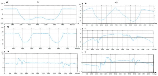 Profile of the worn surfaces obtained in the optical profilometer after a tribological test at 5 and 10 N, respectively, in (a,d) MM, (b,e) MMC and (c,f) MMC-T6.