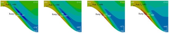Figure 15 shows the stress diagram of the coating with a dense Al2O3 layer. A dense oxide layer gradually formed with the Al2O3 initiating and thickening. The maximum tensile stress was maintained in the peak region at the TGO/BC interface (Peak 2). However, the stress size in the peak region started to change at different interface curvatures (The no. 1 peak region had the lowest stress, and No.4 had the highest stress). The relatively even compressive stress distribution in the ramp region (Ramp 1) can protect the thermal barrier coating more effectively [].