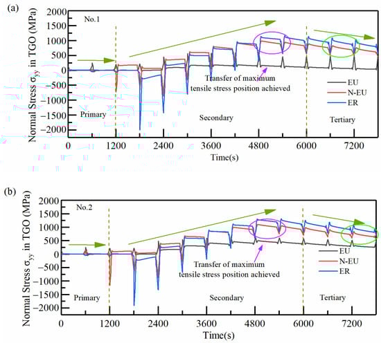 In order to clarify the effect of TGO growth behavior on the distribution and size of coating stresses at different interfacial curvatures, the stresses (σyy) in typical regions with a different number of thermal cycles were extracted and compared for four samples, as shown in Figure 19. Taking No.1 as an example, the hazardous loads at the TGO/BC interface were mainly concentrated in the EU (near the peak region and the ramp region where the tensile stress was close to 0) at the end moment of the first stage of cooling. Large tensile stress (MAX:+201 MPa) existed in the N-EU firstly in the holding state, and the area of dangerous stresses during the holding period began to be transferred in the second stage. The tensile stresses in the three typical regions continuously increased, especially in the ER (the maximum tensile stress existed during the 8th cycle of holding) with the oxidation process. The tensile stresses in N-EU and ER first exceed EU under the cooling phase, completing the region transfer of dangerous stresses under the whole process after entering the 9th thermal cycle (as shown in the pink circular box in Figure 19a). The tensile stress in the typical regions started to decrease with the rapid growth of MO. The dangerous stress transfer phenomenon in the process was over (the tensile stresses in N-EU and ER decreased rapidly below EU in the cooling stage) at the 13th cycle, and the dangerous loads were mainly concentrated in ER, as shown in the green circular box in Figure 19a.