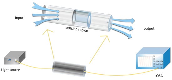 Optical fiber sensing technology began in 1977 []; with the rapid development of optical fiber communication technology, optical fiber sensing technology has become one of the standards for measuring the degree of information technology in a country. Optical fiber sensing technology is a sensing technology that uses the optical signal propagating in the optical fiber to perceive the physical quantity to be measured outside. When the temperature, humidity, magnetic field, electric field, and other external physical quantities to be measured change, the characteristic parameters of the light wave transmitted in the optical fiber, such as the phase, light intensity, wavelength, and so on, will change accordingly, and the change relationship between the characteristic parameters and the physical quantity to be measured will be found out so as to inversely derive the change value of the physical quantity to be measured. The schematic diagram of the optical fiber sensing principle is shown in Figure 1. The light emitted by the light source accesses the corresponding sensing region. When the light source remains unchanged, the external physical quantity to be measured will change, which will affect the beam transmitted in the optical fiber through some mechanism, resulting in corresponding changes in the characteristic parameters of the light wave itself. The changed light is received by the optical spectrum analyzer, and the useful signal is demodulated to achieve the purpose of sensing [,].