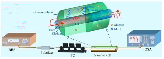 Experimental setup for glucose detection. The upward inset shows the schematical dissection diagram of GOD-GO-modified TFBG. BBS: broadband source; PC: polarization controller [].