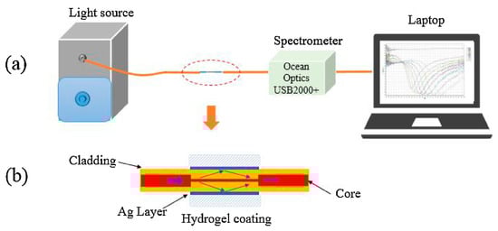 (a) Experimental setup of the sensing system; (b) Schematic of the hydrogel-coating optical fiber SPR sensing part [].