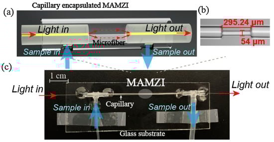 (a) Schematic diagram of the proposed MAMZI structure; (b) Microscopic image of the fabricated MAMZI; (c) Photograph of the encapsulated microfluidic chip [].