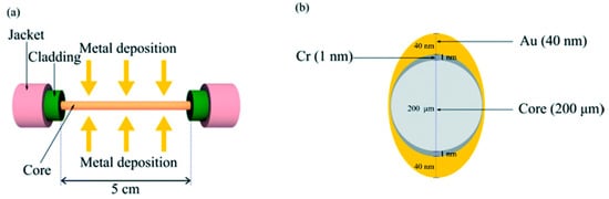 (a) Cr/Au coating on a fiber core; (b) Asymmetric cross-section of metal layers coated on the fiber core [].