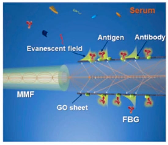 Immunoglobulin G (IgG) and IgG subclasses have always been associated with chronic infections, and the growing awareness that defects or increases in selected IgG subclasses may have clinical consequences has led to a strong interest in quantifying the IgG isotype [,]. In 2019, Wang et al. first proposed and demonstrated a highly sensitive TFBG-SPR biosensor based on GO and Staphylococcal Protein A (SPA) co-modification for IgG detection. The gold film on the surface of the sensor was first fixed with GO and then modified with SPA to improve the sensitivity of the sensor. Experimental results showed that the sensitivity and LOD of the GO-SPA modified TFBG-SPR biosensor were about 0.096 dB/(µg/mL) and 0.5 µg/mL. It showed a better response to human IgG concentrations in the range of 30–100 µg/mL than the TFBG-SPR sensor modified with GO or SPA alone. Its sensitivity is 2.40 times higher than that of an SPA-modified TFBG-SPR biosensor and 1.78 times higher than that of a Go-modified TFBG-SPR biosensor, respectively. At the same time, the sensor has the advantages of an excellent stability, high precision, and flexible production []. The optical fiber biosensor platform based on high-reflectivity FBG also provides a competitive optical fiber platform for targeted biomolecular detection. The schematic diagram of FBG composed of high-reflection FBG, graded refractive index MMF, and SMF is shown in Figure 7. The experiment of detecting IgG in serum by this sensor has verified the specificity of the FBG sensor. At the same time, the sensor achieved an ultra-low detection limit of 32 pM by coating the sensing surface with GO and anti-IgG functionalization without using the signal amplification of functionalized gold nanoparticles or second antibodies. It has great application potential in labeling free biosensing [].