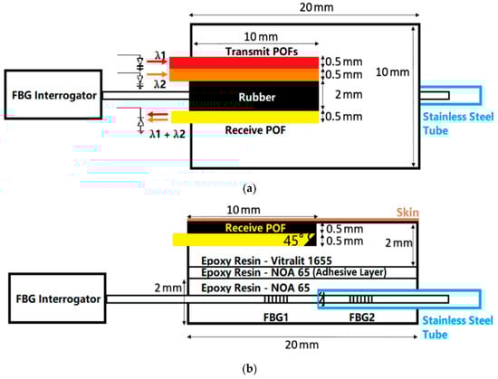 SpO2 is the percentage of the volume of oxygenated hemoglobin bound by oxygen in the blood to the total volume of hemoglobin bound, which is the concentration of blood oxygen in the blood. In normal people, the SpO2 of arterial blood is 98%, and that of venous blood is 75%. Monitoring the SpO2 of arterial blood can estimate the oxygenation and hemoglobin oxygen-carrying capacity of the lungs, and thus, the effectiveness of the cardiopulmonary system can be evaluated []. Continuous oxygen saturation measurement is also valuable in patients with respiratory failure who are undergoing extracorporeal carbon dioxide removal therapy []. Currently, the predominant method for measuring SpO2 is based on photoplethysmography (PPG) []. To accurately calculate SpO2, the average of multiple pulse cycles is required to enhance precision, resulting in a loss of real-time measurement []. In 2018, Liu et al. proposed a novel integrated optical fiber sensor probe that combines contact pressure for detecting SpO2. Figure 8 shows the probe design. The sensor comprises three plastic optical fibers (POF) and one FBG sensor. Each plastic optical fiber used in the pulse oximeter is split at a 45° angle at its distal end. All fibers are encapsulated in a biocompatible epoxy resin patch to reduce motion artifacts in the photoplethysmogram (PPG). Additionally, this design allows for the conversion of lateral loads into the axial strain in the FBG. Test results indicate that combining pressure measurements from FBG and a reference FBG yields reliable results with lower latency and relatively minimal temperature influence. The measurement error for contact force within the range of 5 to 15 kPa is less than 2%. In wearable technology, this probe could be employed to optimize the fit of garments utilizing this technology, achieving reliable measurement results by applying appropriate pressure. A reference FBG for temperature compensation has been added to the sensor, and in future designs, a compensation FBG for the axial strain could be incorporated to eliminate axial strain interference. Additionally, algorithm modifications for calculating SpO2 could be implemented to reduce discrepancies between the designed sensor and commercial pulse oximeters [].