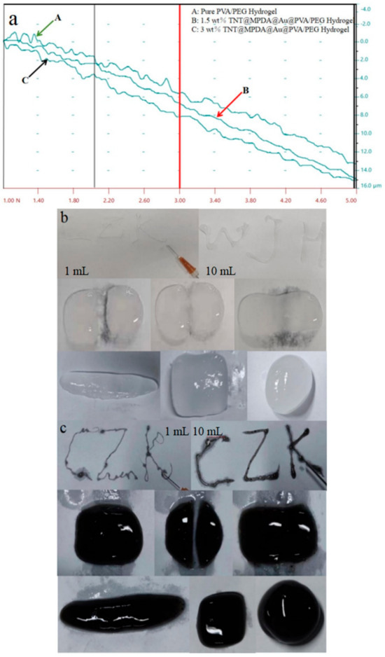 A total of 15 g of PVA was gradually added to 200 mL of distilled water and the resulting mixture was magnetically stirred at a temperature of 95 °C until a uniform and transparent solution was achieved. TNT@MPDA@Au nanotubes were incorporated into the PVA solution and subjected to stirring for 4 h [42,43]. Subsequently, 5 g of PEG was introduced into the solution, and the stirring process was sustained for 0.5 h. The obtained solution was transferred into a plastic mould, frozen at −20 °C for 8 h, subsequently thawed at room temperature for 4 h, and subjected to 3 cycles of freezing and thawing to yield composite hydrogels consisting of TNT@MPDA@Au@PVA/PEG [44].