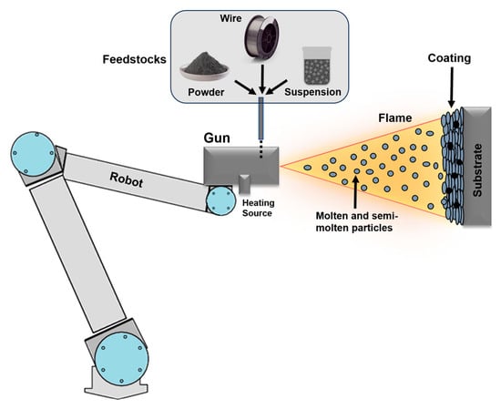 Thermal spraying is a surface engineering technique in which a feedstock material, typically in the form of powder, wire, or suspension, is heated and accelerated toward a substrate, forming a protective or functional coating. This process relies on the plastic deformation and solidification of high-velocity, high-temperature particles upon impact, creating a dense, layered coating structure []. Nearly any material that can be melted without decomposition can be thermally sprayed [,]. The heat source may be derived from combustion or an electric arc []. The coating is then formed by a series of overlapping layers in a lamellar shape, arising from the scattering of the molten and semi-molten particles []. Figure 2 presents a simplified schematic of the thermal spraying process.
