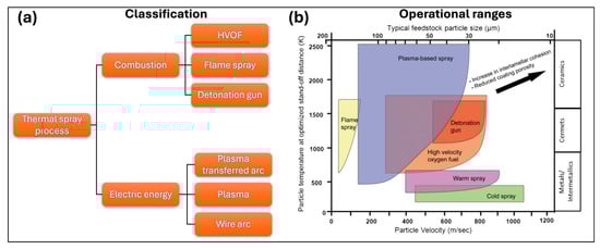 Thermal spray map illustrating the (a) classification of the process by energy source [,,] and (b) typical operational ranges of the major techniques based on particle velocity, temperature, and size, adapted from [].