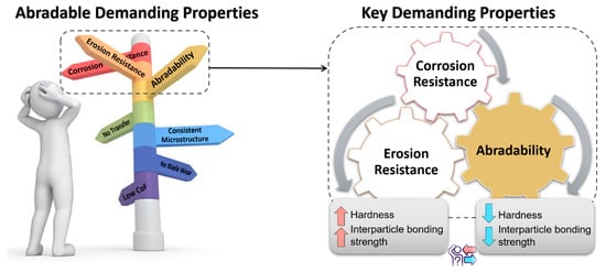 Figure 5 presents a schematic of the key factors to consider in the selection and development of an abradable coating, where properties such as hardness and interparticle bonding strength often stand in contrast when optimizing for erosion resistance versus abradability. Enhanced erosion resistance requires higher hardness and stronger interparticle bonding, whereas effective abradability favors lower hardness and weaker bonding to facilitate controlled material removal, as indicated by the arrows in the figure.