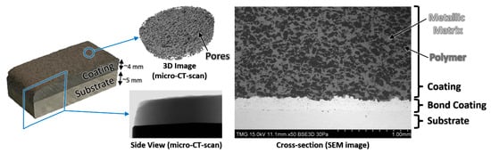 In addition to compositional design, porosity is often deliberately introduced through feedstock engineering or by adjusting thermal spray parameters. While increased porosity, generally governed by the volume fraction and size of pores, tends to improve abradability, it often reduces erosion resistance, thereby requiring careful optimization [,]. For instance, Liu et al. [] demonstrated that the volume of filler material plays a significant role in determining the abradability of aluminum-based coatings. Beyond porosity control, polymeric additives are also employed to reduce stress propagation during blade–coating interactions []. Stringer and Marshall [] further emphasized that such additives help limit damage to the structural matrix phase, supporting coating integrity under service conditions. Figure 6 presents a typical coating configuration of a metallic-based abradable coating incorporating polymer filler material, illustrated through macro photography, micro-CT imaging, and SEM analysis. Figure 6 highlights the distribution of filler material, the porosity network, and the underlying bond coat layer applied to enhance adhesion to the substrate.