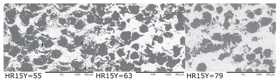 A well-established metallic-based abradable coating system is AlSi incorporated with 40 wt.% polyester [,,], in which the polyester serves as a fugitive filler phase. The polyester lowers the overall coating hardness and promotes controlled porosity, without significantly compromising adhesion strength []. Figure 7 presents cross-sectional micrographs of AlSi coatings containing different polyester contents, illustrating the inverse correlation between filler concentration and HR15Y hardness. In the images, the lighter regions correspond to the aluminum–silicon metallic matrix, while the darker regions indicate the presence of the polymer filler [].