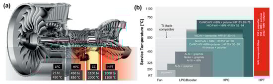 As we move towards the hotter sections of the engine, such as the high-pressure compressor (HPC) and turbine (HPT), more advanced materials are required. Here, Co- and Ni-based alloys and ceramic abradables are applied to support the hotter temperatures, with the choice of matrix being a function of the specific region’s thermal load. Under high-temperature service conditions (≥1300 °C), however, conventional metal-based materials increasingly exhibit service performance limitations due to their insufficient thermal stability [].
