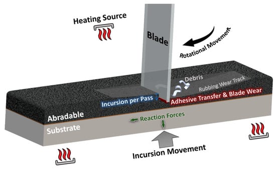 To overcome these limitations, a multifaceted assessment strategy has emerged as a standard practice. Abradability evaluation is employed using specialized test rigs capable of simulating engine-representative conditions. These tests provide critical insights into coating wear mechanisms, blade degradation, frictional responses, and potential material transfer phenomena at the blade tip [,,]. A schematic representation of the rubbing process in conventional abradability testing is shown in Figure 9.