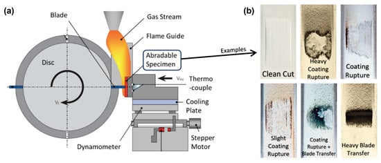 Consequently, abradability evaluation under representative engine conditions is indispensable. Conventional tribological tests lack the high-speed, transient thermomechanical fidelity required to reproduce blade–coating rub events, which involve rapid frictional heating, evolving stress fields, and potential adhesive transfer []. To bridge this gap, specialized high-speed abradable test rigs have been developed by leading research institutions and industry partners, such as Oerlikon Metco [], NRC Canada [], the University of Sheffield [], and BGRIMM []. These rigs have emerged as a solution to simplify and economize evaluation processes [,]. It fundamentally works by rotating a simulated turbine blade at relevant tip speeds against a stationary abradable specimen while precisely controlling key inputs: blade speed, incursion rate, incursion depth, and operating temperature. Sophisticated instrumentation captures critical outputs such as tangential and normal reaction forces, rubbing temperatures, blade wear, and adhesive transfer, alongside indirect observations such as debris morphology and surface topology.