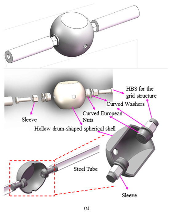 The bolted drum-shaped spherical shell joint is mainly composed of high-strength bolts, sleeves, curved European nuts, curved washers, hollow drum-shaped spherical shell, and related rods; the schematic diagram of the joint is shown in Figure 1.