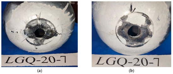 Specimens LGQ-20-7 and LGQ-20-8 underwent low-cycle reciprocating tests with a loading amplitude of (3.5Δy) 8.4 mm. During the tests, it was observed that the welded liner inside the shell cavity progressively deepened and expanded from a short crack to a full fracture as the number of cyclic loadings increased, as shown in Figure 9f below. Various degrees of extrusion deformation and partial cracking occurred within the stressed bolt holes. During the cyclic loading, the cracks initiated at the bolt holes and gradually expanded outward along the meridian, eventually intersecting with peripheral ring cracks after multiple cycles. The upper and lower stressed bolt holes exhibited varying degrees of deformation in the curved washer, resulting in different levels of fit with the curved surface of the drum body, which caused distinct white paint peeling patterns at the upper and lower bolt holes.