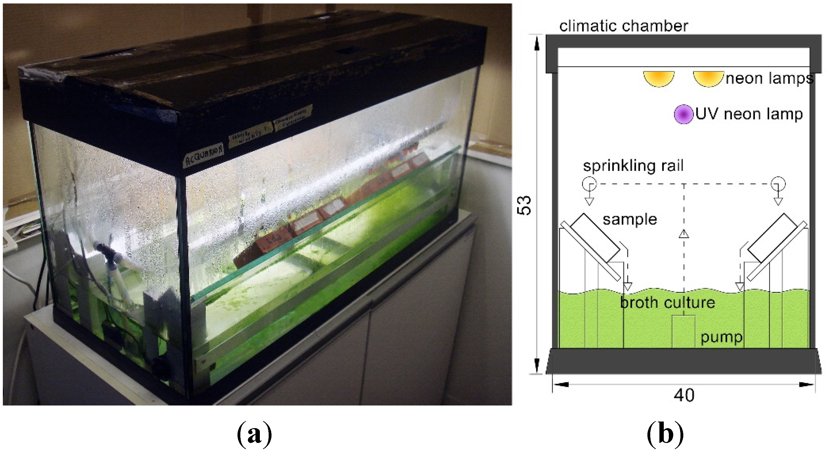 In order to perform the accelerated growth test, a water run-off test was carried out (for 12 weeks) inside a glass chamber in which specimens were positioned on two aluminum racks, front-to-front along the long dimensions of the chamber (scheme in Figure 2).